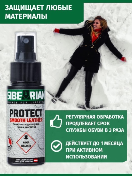 Водоотталкивающая пропитка SIBEARIAN PROTECT — универсальное средство для защиты обуви, одежды и аксессуаров из кожи, замши, нубука, текстиля и их сочетаний. Пропитка создает ультратонкое полимерное покрытие, которое надежно защищает от влаги, грязи, соли и реагентов, при этом сохраняет воздухопроницаемость материалов.