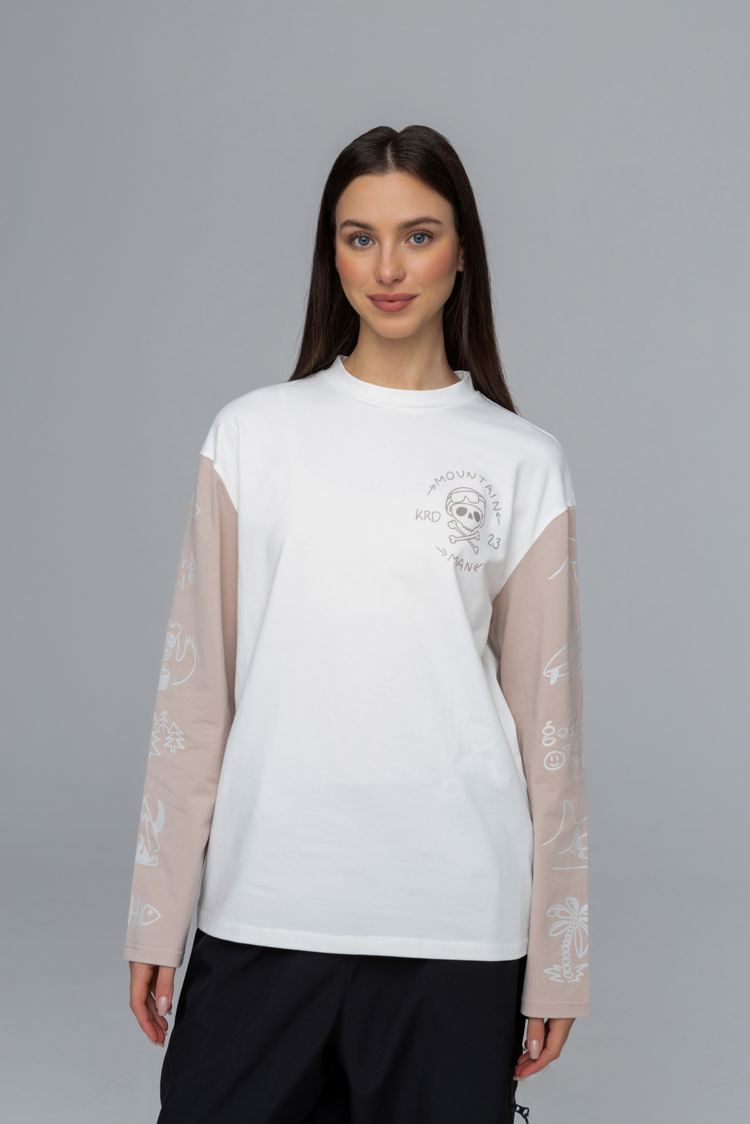 Модель изготовлена из приятной к телу кулирной глади (92% хлопок и 8% эластан), что обеспечивает лёгкость, воздухопроницаемость и эластичность. В лонгсливе комфортно в температурном диапазоне от +15 до +30°C — он идеально подходит как на тёплый день, так и в прохладный вечер. Принт на груди добавляет индивидуальности и акцентирует внимание на образе.