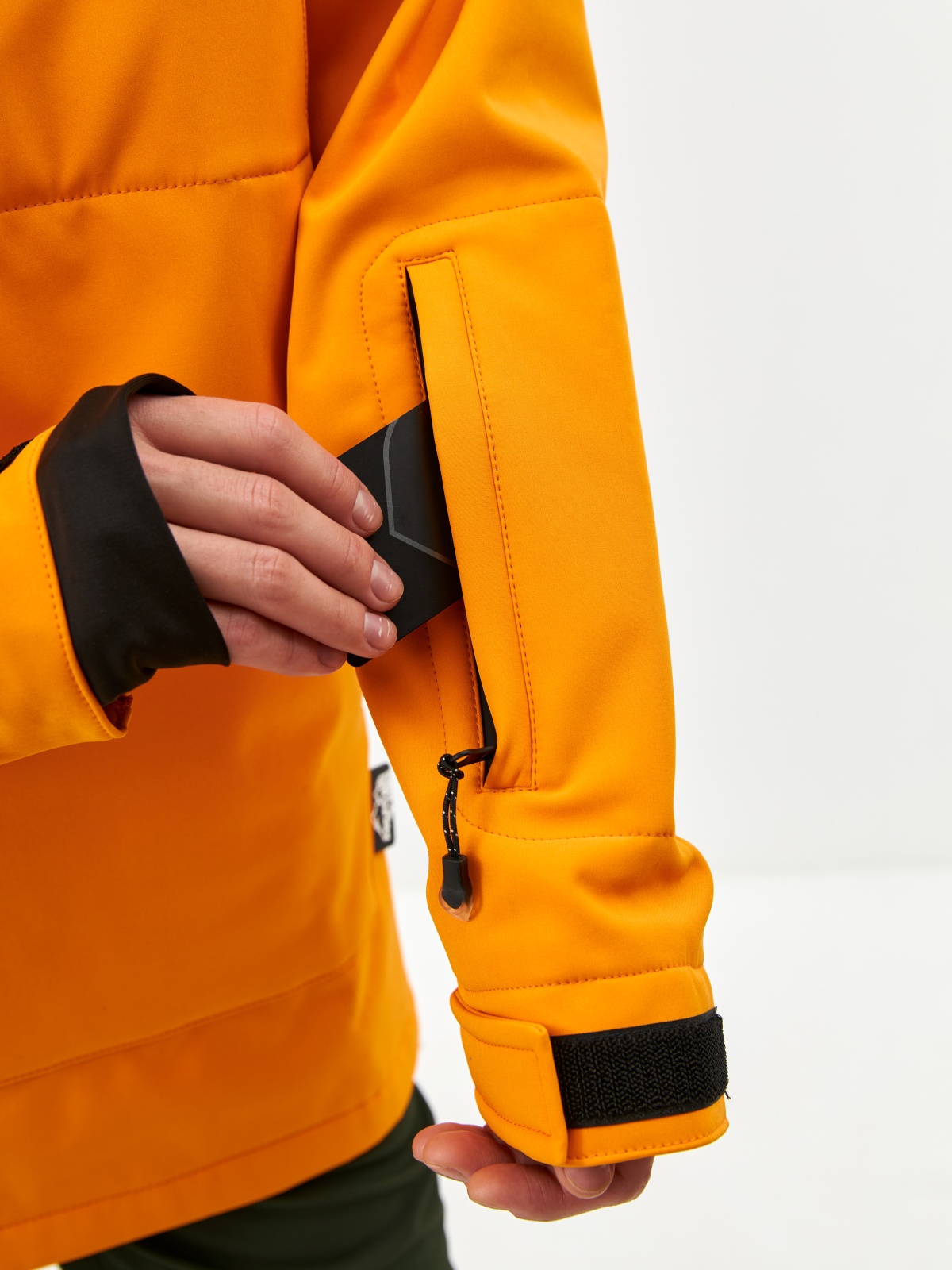 - Карман на рукаве для ski-pass, нагрудный карман для мелочей и вместительный карман-кенгуру — все на влагозащитных молниях.